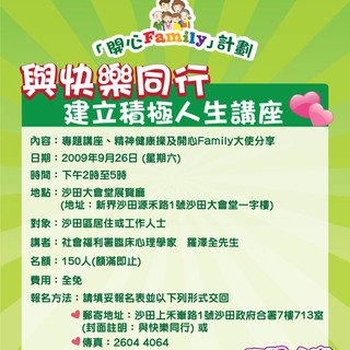 「與快樂同行 – 建立積極人生講座」是「開心Family」計劃的其中一項活動,旨在提升參加者處理壓力的技巧,認識正面的情緒健康。講座內容豐富,包括由社會福利署臨床心理學家羅澤全先生主講的專題講座,亦有精神健康操及開心Family大使分享。現誠邀 大眾參與是次講座,使精神健康訊息得以廣泛宣揚,人人與快樂同行,有關活動詳情可參活動海報。